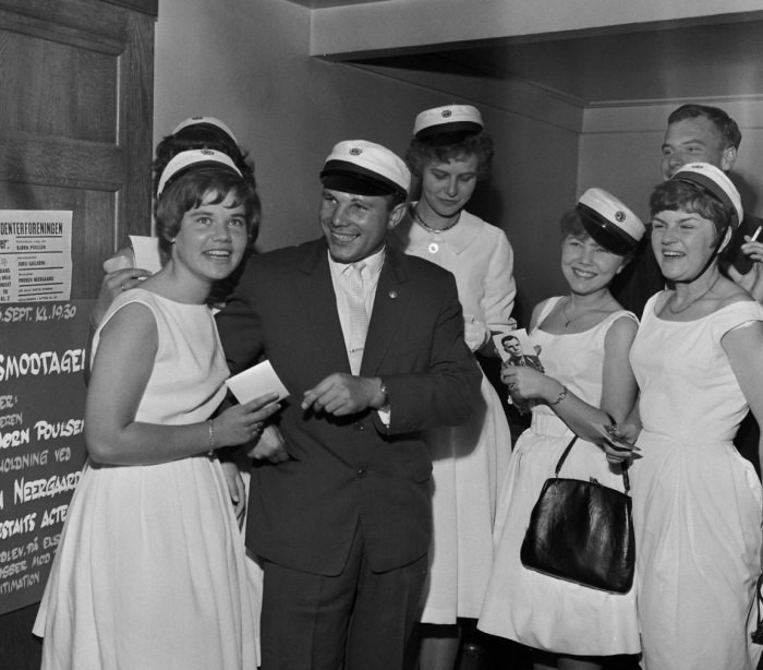 Редкий кадр Юрия Гагарина на встрече с датскими студентами во время визита в Копенгаген в 1962 году — живое свидетельство его открытости и огромного интереса мира к первому космонавту.
