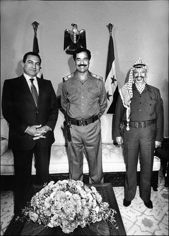 Хосни Мубарак, Саддам Хуссейн и Ясир Арафат во время встречи в Багдаде в 1988 году — исторический снимок, отражающий сложную политическую реальность Ближнего Востока того времени.