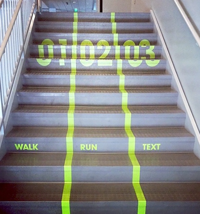Чтобы никто не толкался, лестницу разделили на три части: для тех, кто спешит; тех, кто идет спокойно, и тех, кто пишет СМС на ходу.