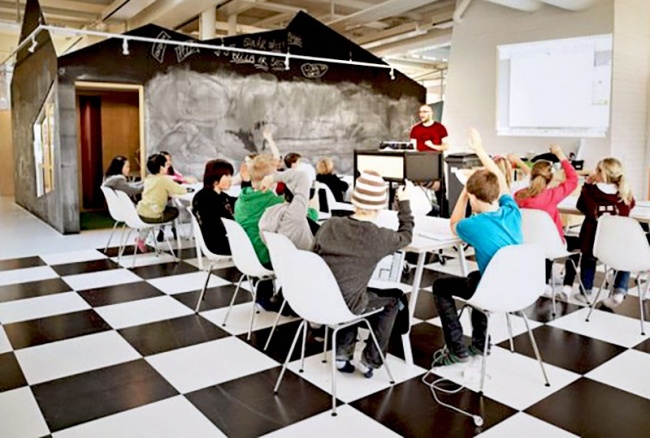 В этой шведской школе нет стен. Ученики занимаются в группах по интересам в разных тематических зонах.