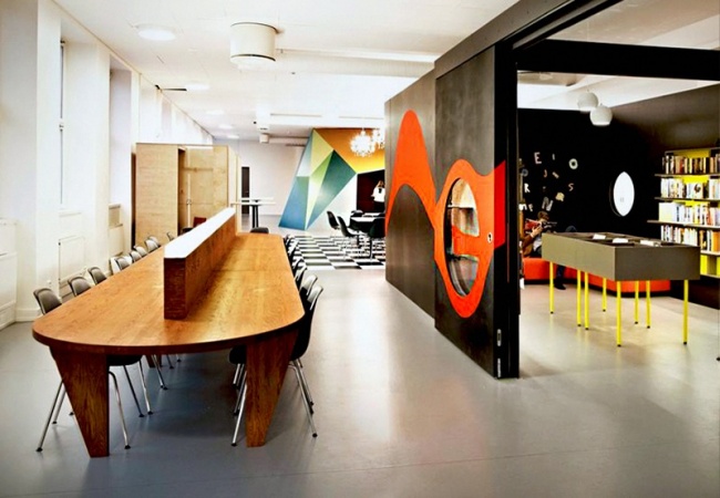 В этой современной библиотеке яркий дизайн и много удобных кресел.