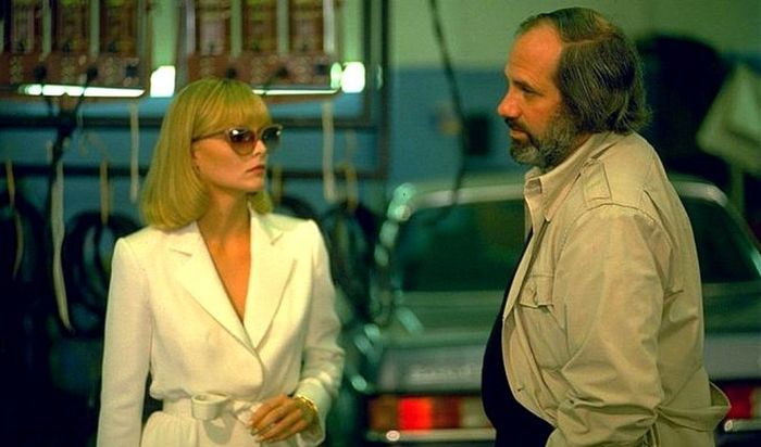 Мишель Пфайффер и режиссер Брайан Де Пальма на съемочной площадке фильма «Лицо со шрамом» (Scarface), 1983 год.