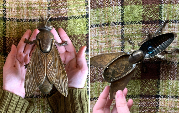 «Я нашла эту латунную пепельницу-муху в комиссионном магазине в Висконсине. Я собираюсь наполнить её красивыми камешками, которые нашла на нашем заднем дворе»