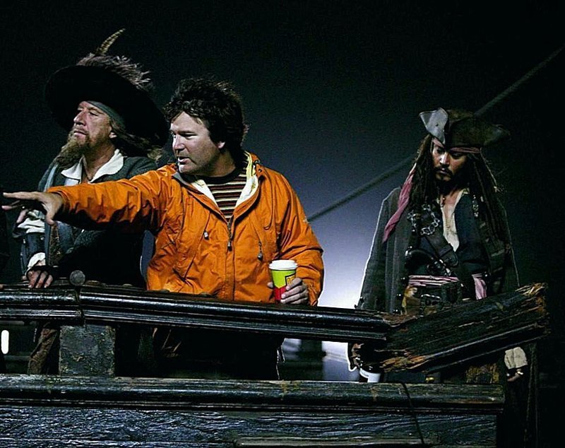 Джонни Депп, Джеффри Раш и Гор Вербински на съемочной площадке фильма «Пираты Карибского моря: Проклятие Черной жемчужины».