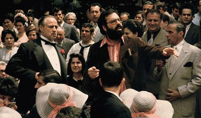Фрэнсис Форд Коппола в окружении актеров, исполняющих роли семьи Корлеоне.