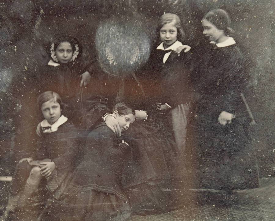 Королева Виктория с детьми, 1852 г. Королева лично стерла с фотокарточки своё лицо – ей не понравилось, как она получилась