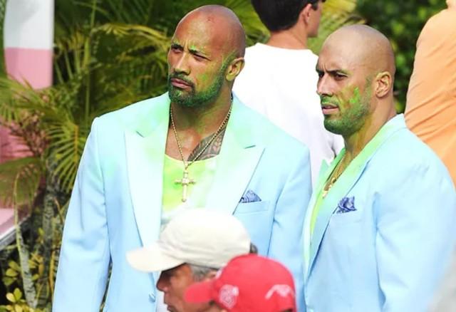 Дуэйн “Скала” Джонсон и его двойник-каскадер стоят бок о бок во время съемок фильма “Кровью и потом: Анаболики”