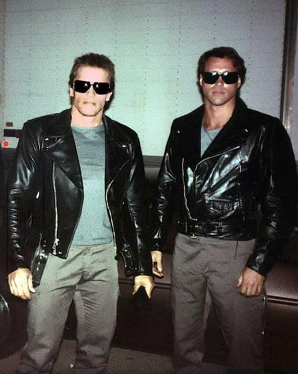 Арнольд Шварценеггер со своим дублером Питером Кентом на съемках фильма “Терминатор”, начало 1980-х годов