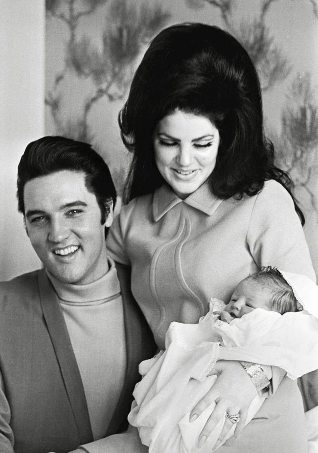 Элвис Пресли и Присцилла Пресли со своей дочерью Лизой Мари Пресли, 1968 год