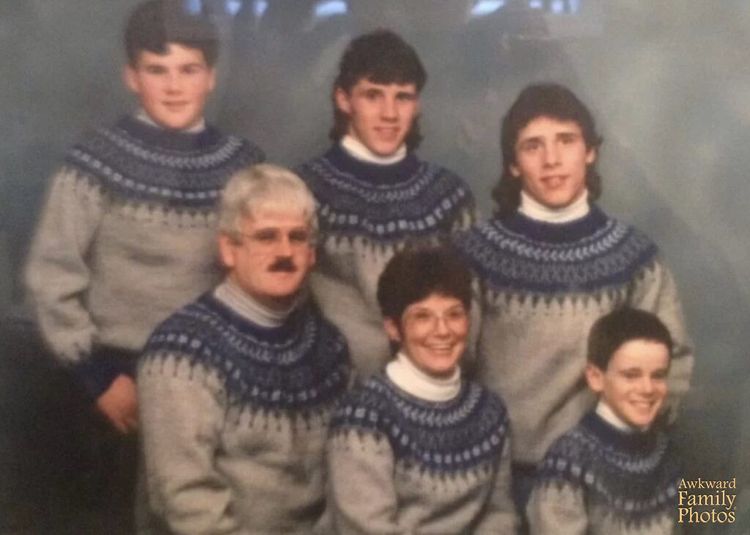 “Я, моя мама, мой отчим, мой брат и мои сводные братья. Эти свитера связала подруга моих родителей. В то время я чувствовал себя идиотом, нося его, но, оглядываясь назад, я думаю, что это было весело”