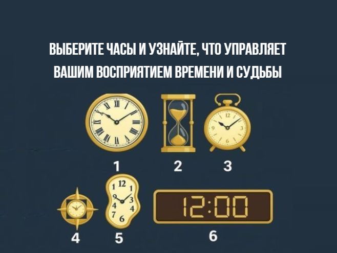 Предлагаем вам пройти простой визуальный тест. Перед вами — шесть разных часов, и каждый из них символизирует уникальный психологический образ. Не анализируйте, просто доверьтесь интуиции и выберите те часы, которые наиболее откликнулись вам на уровне ощущений. Их форма, стиль, цвет или структура — всё это вызывает у вас внутренний резонанс не случайно. Через символ часов проявляется ваше бессознательное отношение ко времени… и к судьбе.