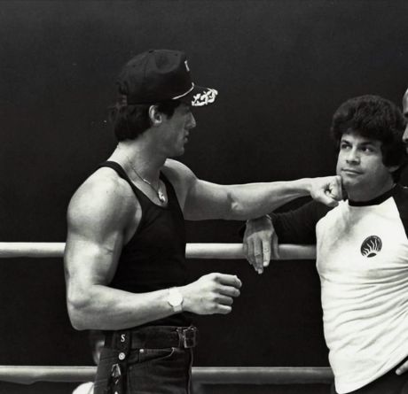 Сильвестр Сталлоне уже на ринге и показывает, куда надо бить, на съёмках фильма «Рокки 3»